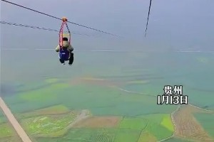 男子坐高空滑索,体验翱翔空中的感觉